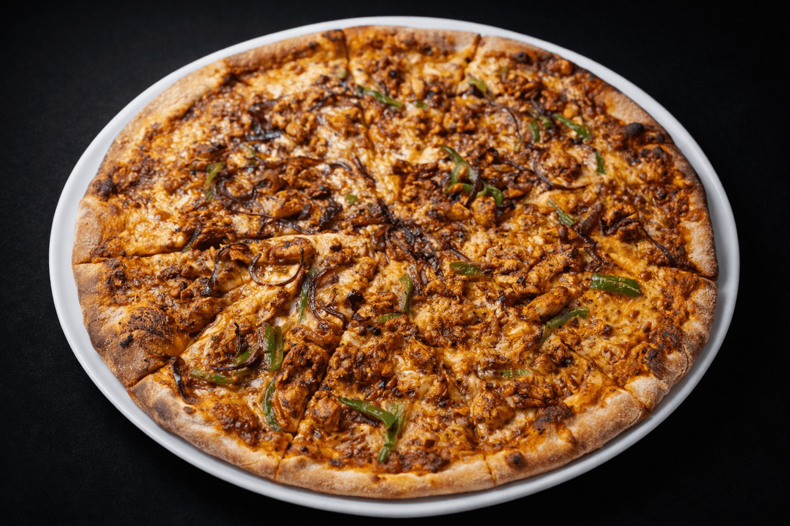Our signature pizza features a flavorful tikka sauce base, succulent chicken marinated in aromatic tikka spices, finished with crisp green peppers and onions.