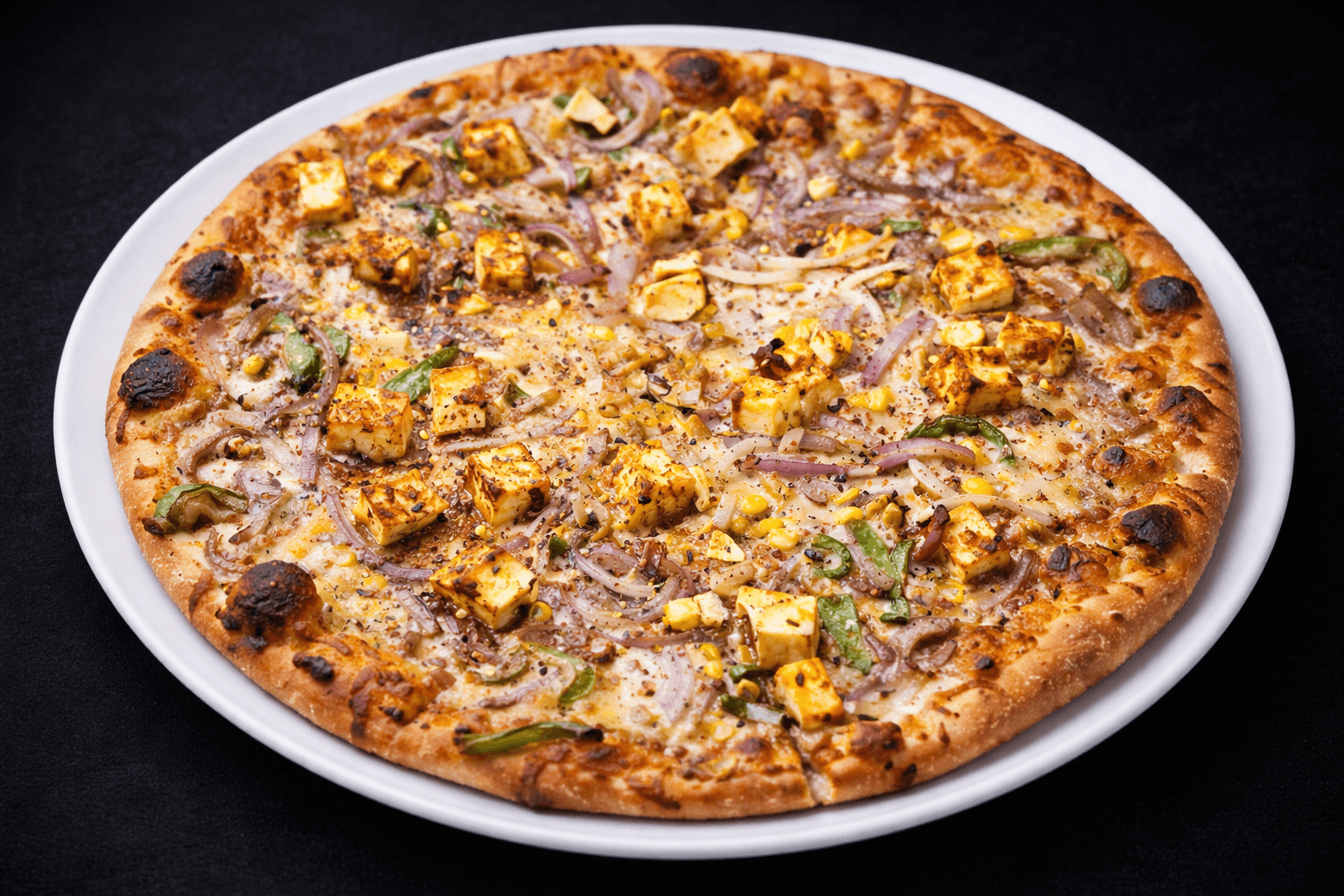 Our signature pizza features a flavorful tikka sauce base, succulent paneer marinated in aromatic tikka spices, finished with crisp green peppers and onions.